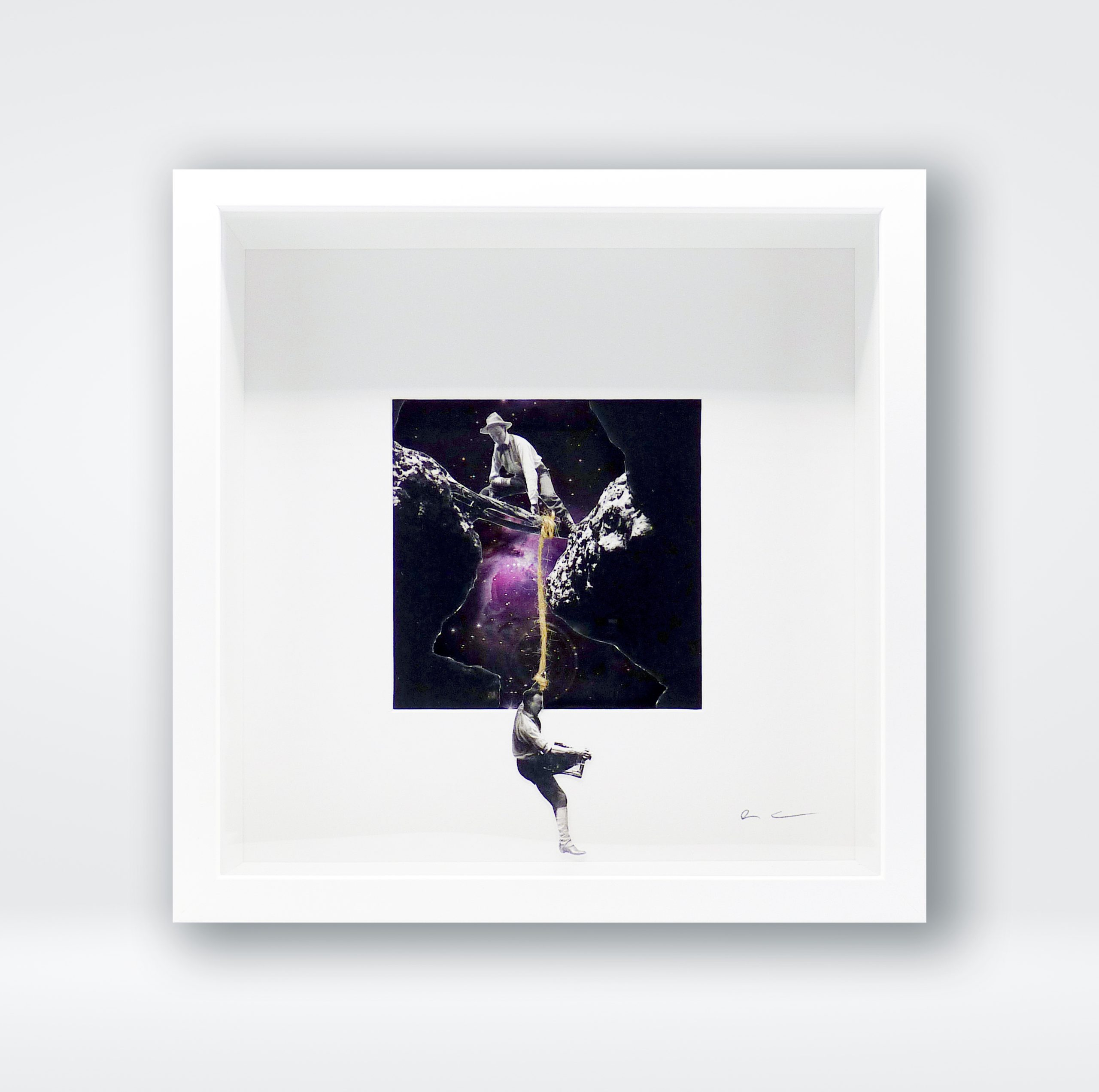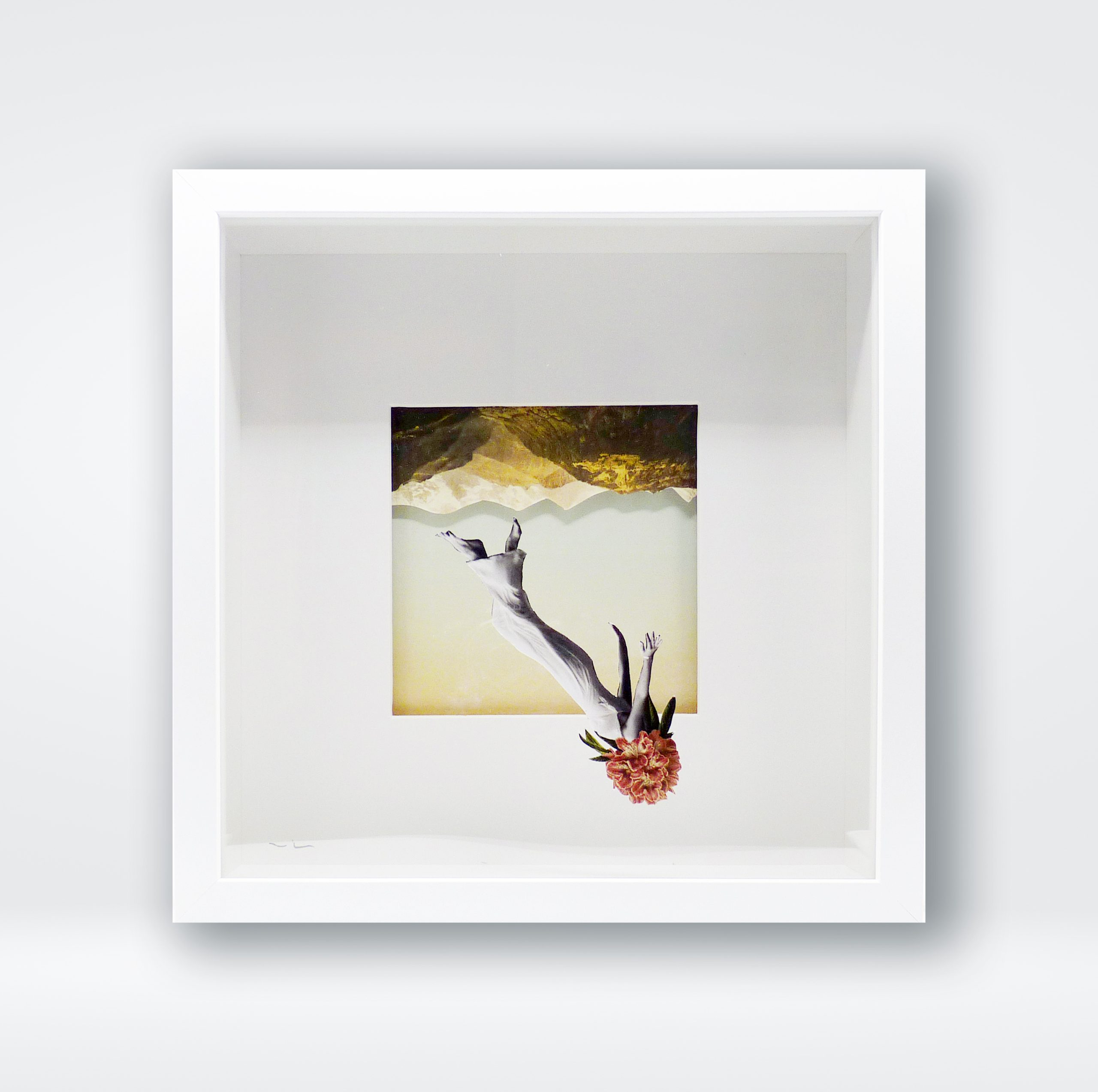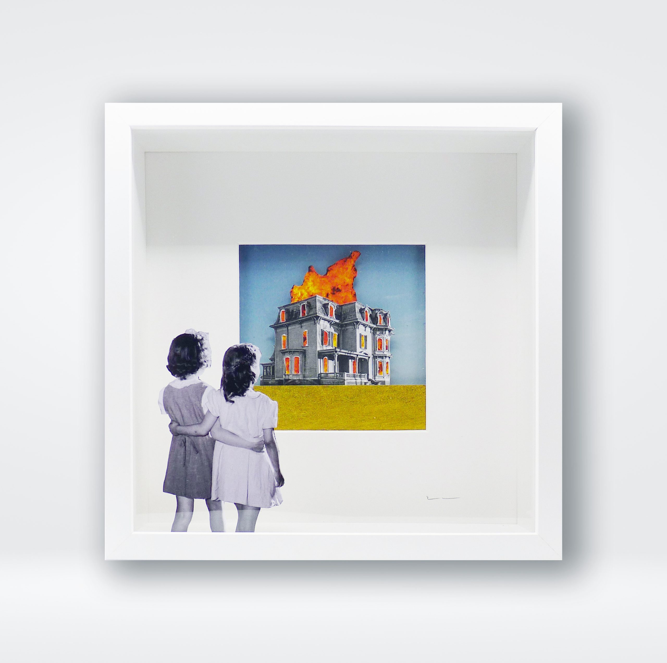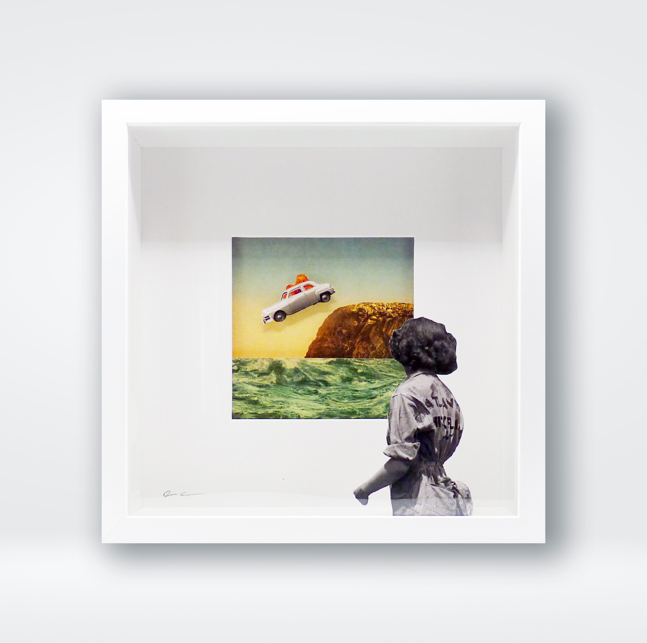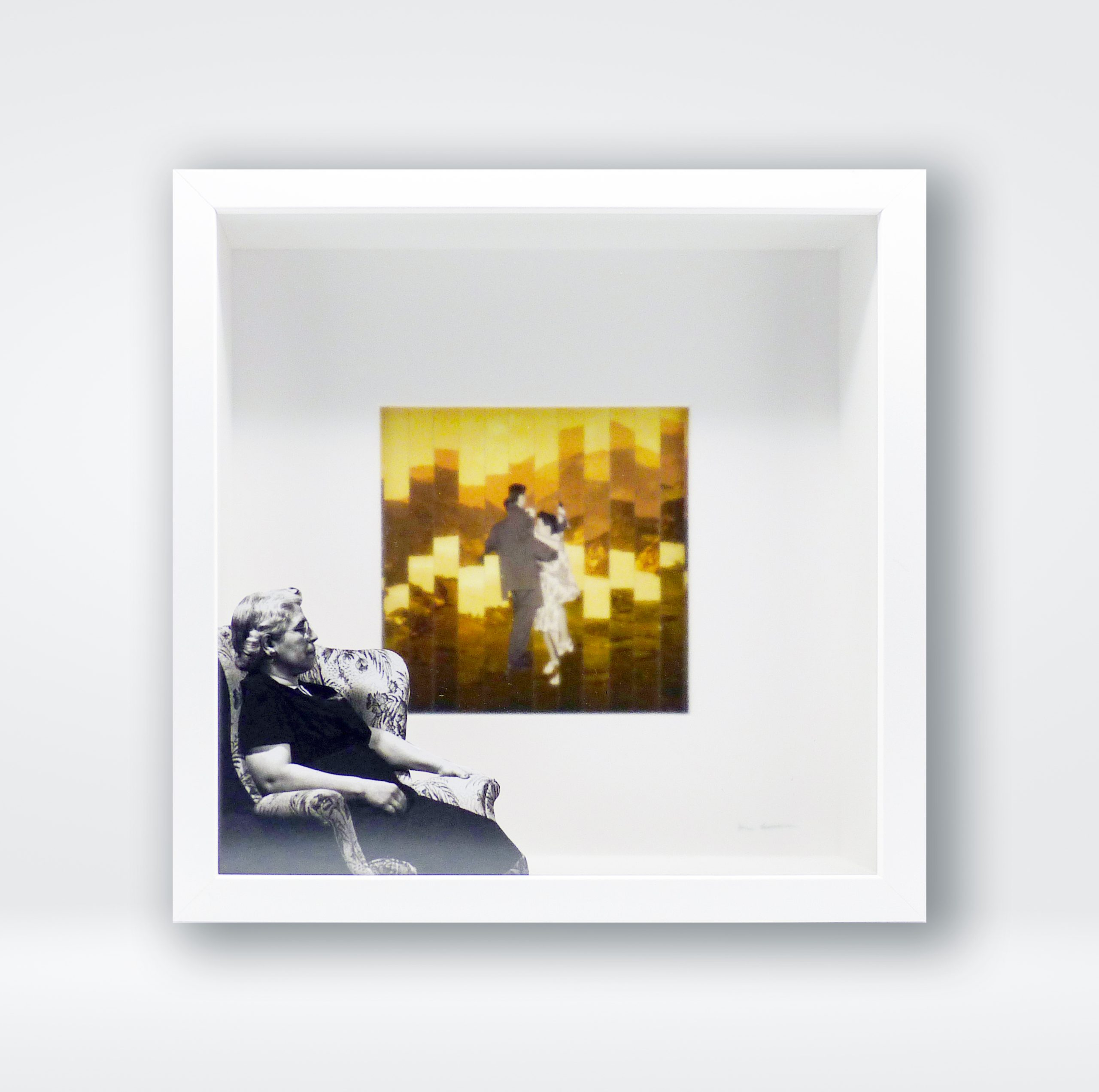 Cada obra en 12alcuadrado comienza con un marco sueco de nombre impronunciable. Dentro de ese espacio limitado y tridimensional, exploro la riqueza visual de fotografías antiguas, recortes de revistas, y otros tesoros gráficos. Estas imágenes, que han vivido sus propias historias, son la base para crear mis propios relatos que transitan entre el futuro, el presente y el pasado. Cada obra es un diorama donde los distintos planos se unen formando pequeñas escenas tridimensionales.