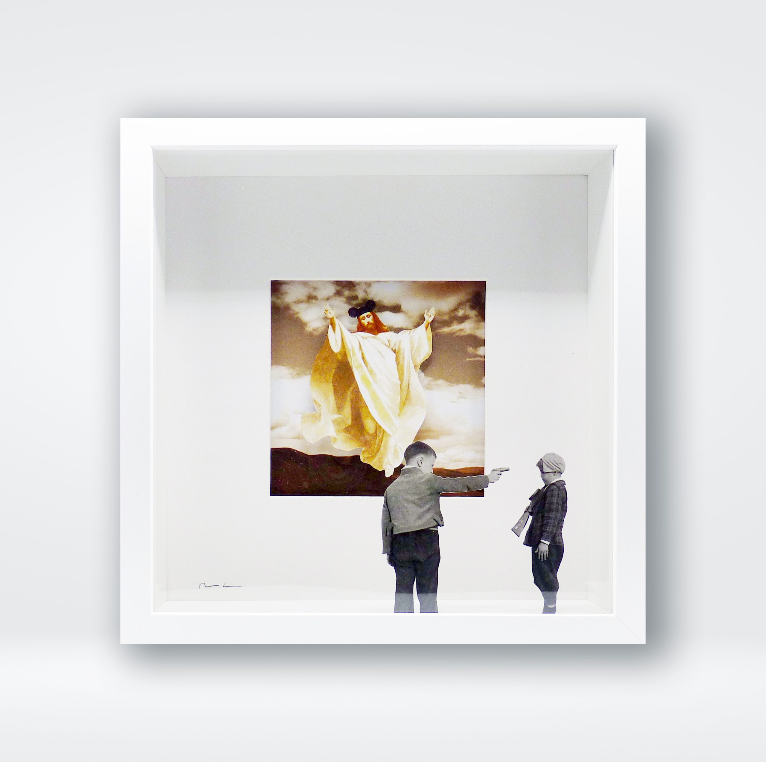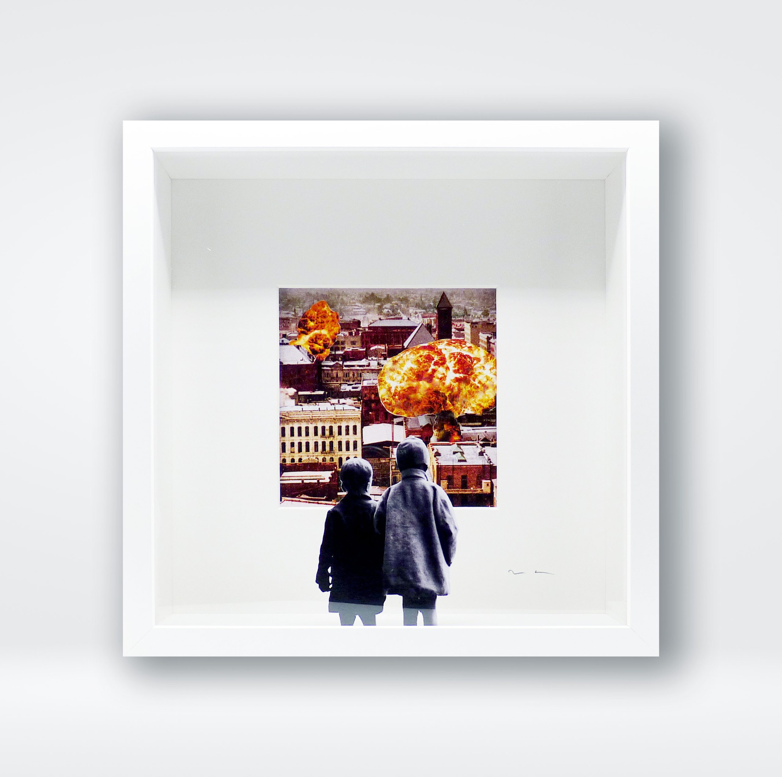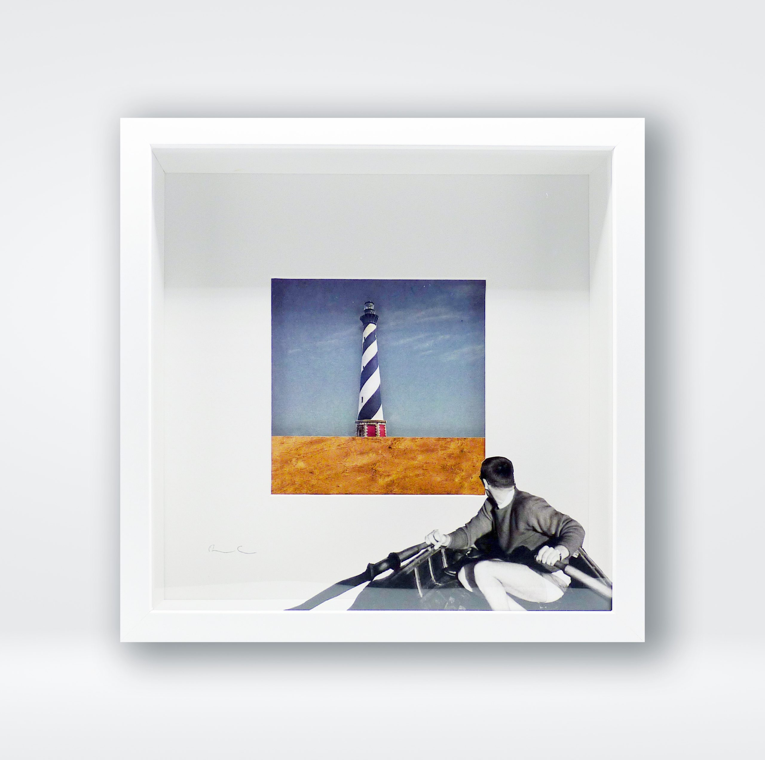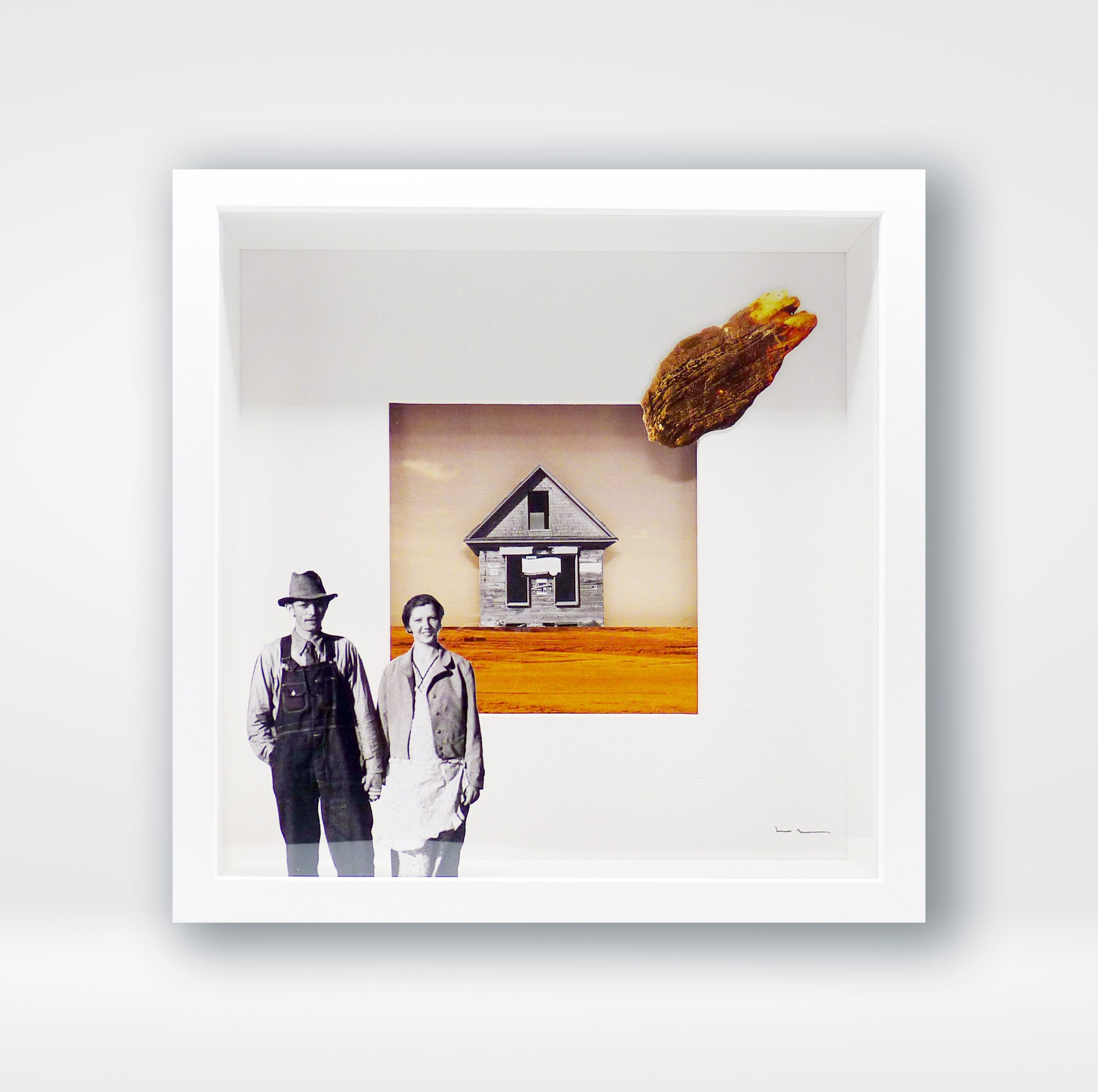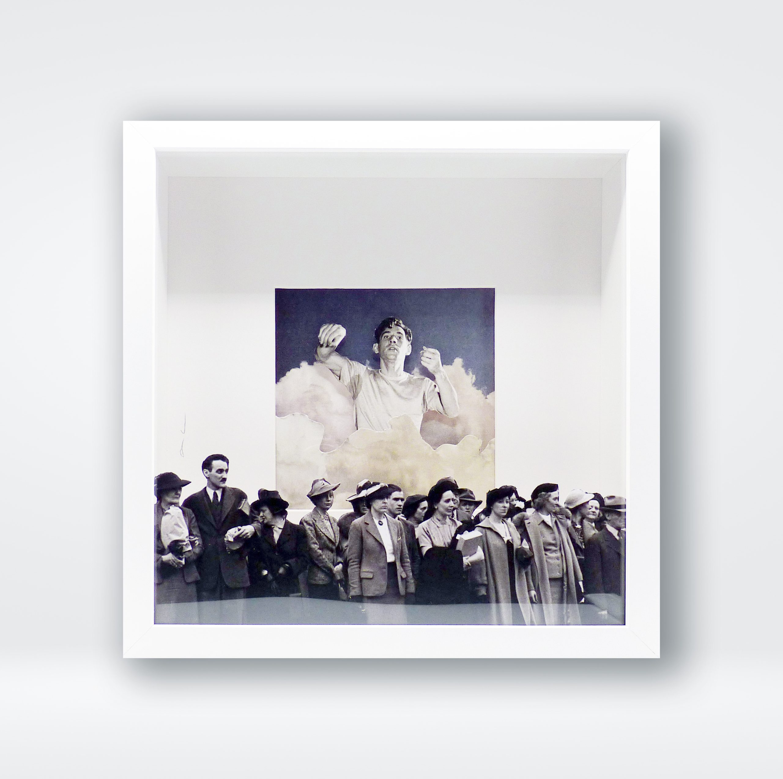 Cada obra en 12alcuadrado comienza con un marco sueco de nombre impronunciable. Dentro de ese espacio limitado y tridimensional, exploro la riqueza visual de fotografías antiguas, recortes de revistas, y otros tesoros gráficos. Estas imágenes, que han vivido sus propias historias, son la base para crear mis propios relatos que transitan entre el futuro, el presente y el pasado. Cada obra es un diorama donde los distintos planos se unen formando pequeñas escenas tridimensionales.